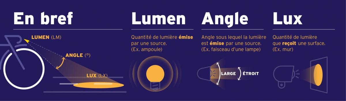 Le code de la route impose au cycliste de s'équiper d’un éclairage avant de 10 lux à 10 mètres. Cette valeur est juste suffisante pour circuler en ville avec éclairage public. La FUB recommande de s’équiper à minima d’un éclairage de 30 lux à 10 mètres.